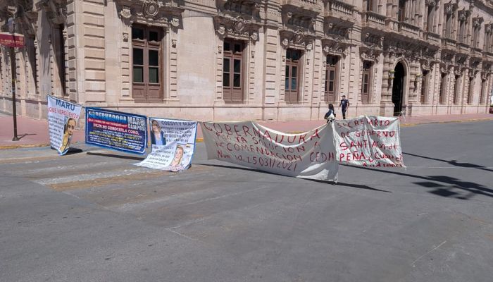Los inconformes también se colocaron sobre la calle Aldama, frente al Palacio de Gobierno, donde instalaron mantas y sillas para impedir la circulación vehicular.