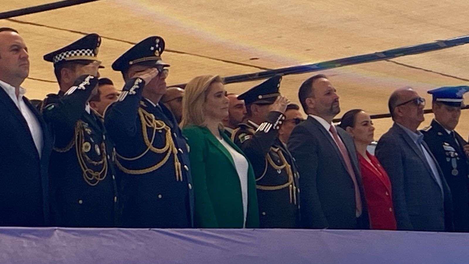 La mandataria estatal asistió acompañada de su gabinete, entre ellos el secretario general de Gobierno, Santiago de la Peña Grajeda; el secretario de Educación y Deporte, Hugo Gutiérrez Dávila; el fiscal general del Estado, César Jáuregui Moreno; y el secretario de Seguridad Pública Estatal, Gilberto Loya Chávez. También estuvieron presentes la presidenta del Tribunal Superior de Justicia, Marcela Herrera, el presidente del Congreso local, Guillermo Ramírez, y mandos militares de la región.