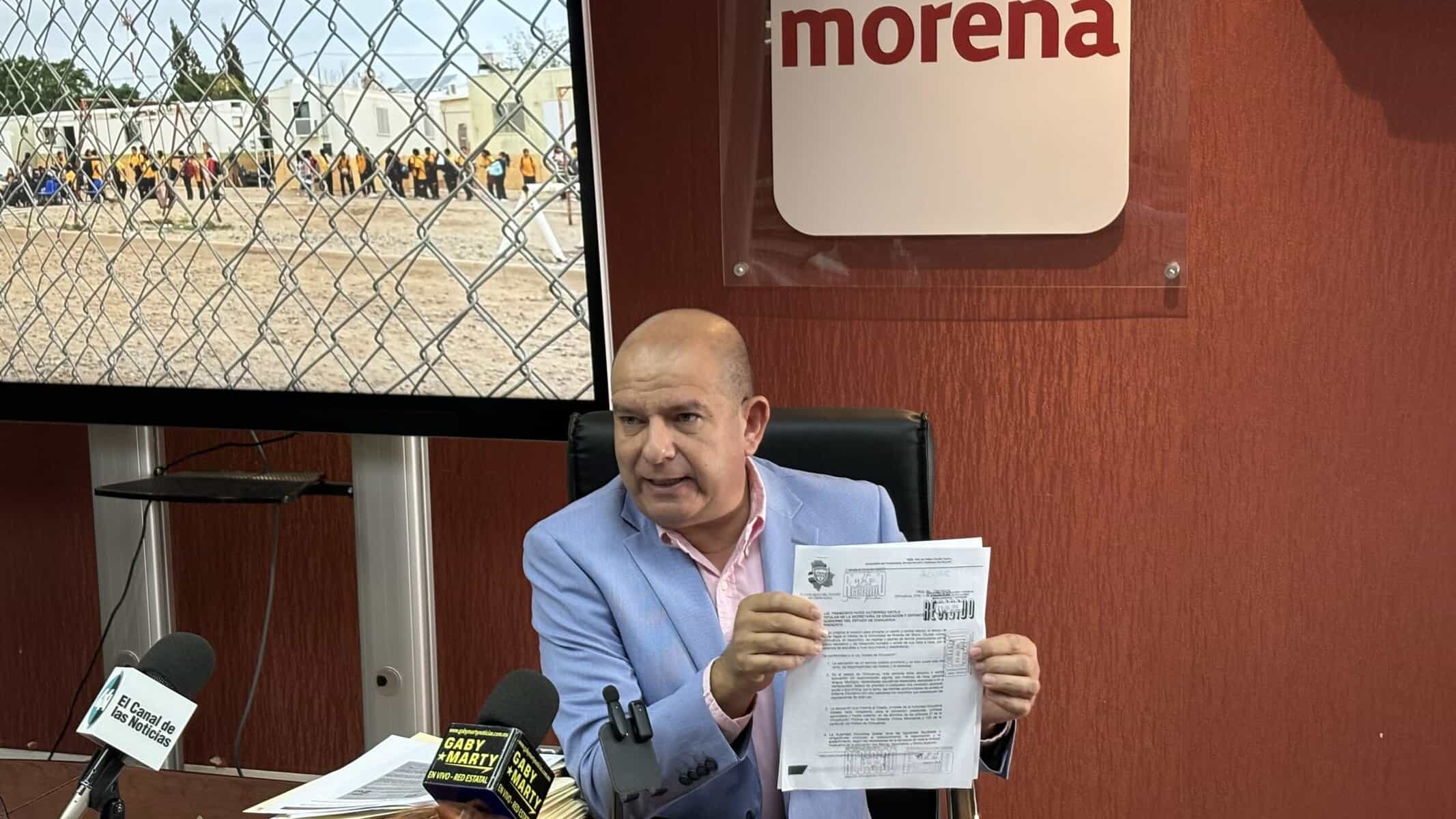 Chihuahua, Chih.-El diputado Cuauhtémoc Estrada Sotelo, coordinador del grupo parlamentario de Morena, denunció las malas condiciones en las que opera la Escuela Secundaria Francisco I. Madero 3081, ubicada en la colonia Riberas del Bravo, en Ciudad Juárez, donde maestros y alumnos se ven obligados a tomar clases al aire libre por la falta de infraestructura.
