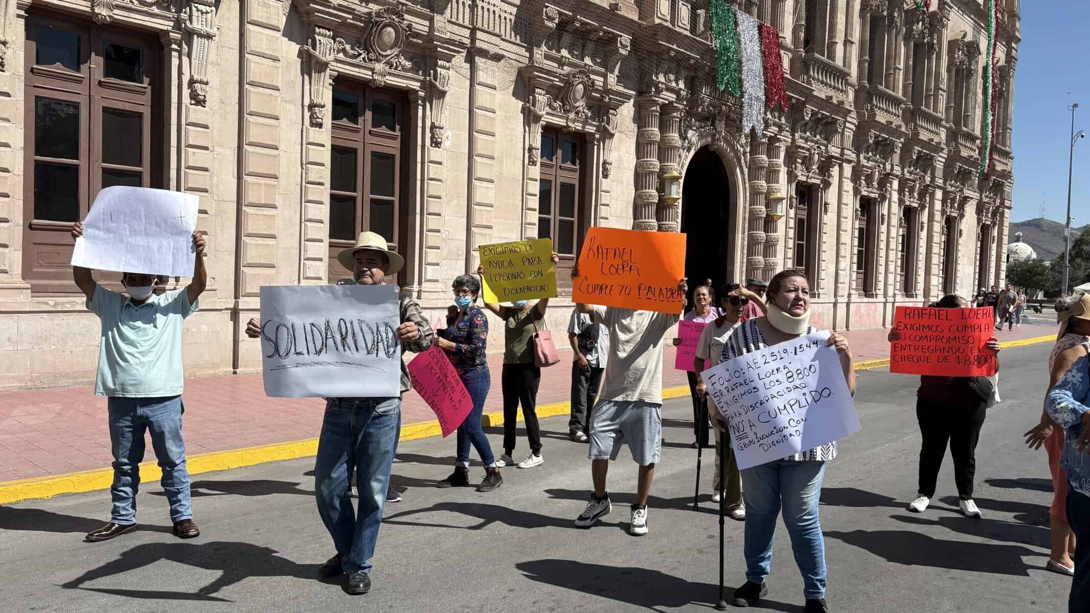 Chihuahua, Chih.- Un grupo de personas con discapacidad, en su mayoría adultos mayores, se manifestó este martes frente al Palacio de Gobierno de Chihuahua para exigir el cumplimiento de los apoyos económicos comprometidos por la Secretaría de Desarrollo Humano y Bien Común.