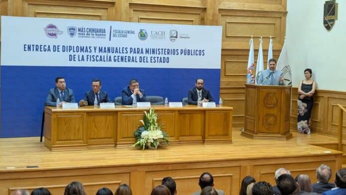Chihuahua, Chih. – En un acto celebrado en la Facultad de Derecho de la Universidad Autónoma de Chihuahua (UACH), fiscales del estado recibieron sus diplomas tras concluir el diplomado en Teoría del Delito, además de presentarse oficialmente el nuevo manual operativo para Ministerios Públicos, una herramienta que busca estandarizar criterios y mejorar la atención a la ciudadanía.