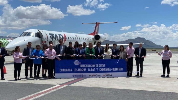 Chihuahua, Chih.— La gobernadora del estado, María Eugenia Campos Galván, encabezó este martes la inauguración oficial de las nuevas rutas aéreas operadas por TAR Aerolíneas, que conectarán a la capital del estado con Los Mochis, La Paz y Querétaro, fortaleciendo así la conectividad regional, así como el desarrollo turístico y comercial.