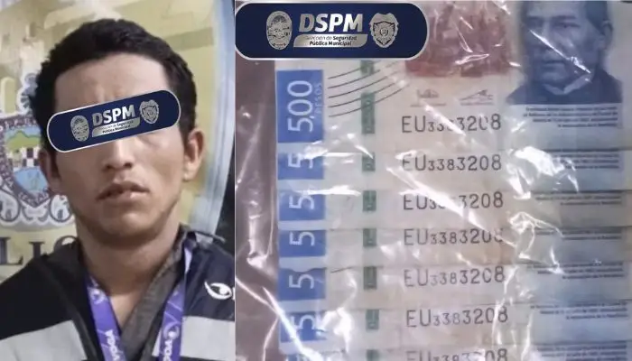 Durante la revisión, los agentes encontraron en poder del joven un total de 3,500 pesos en billetes de 500 pesos falsificados.