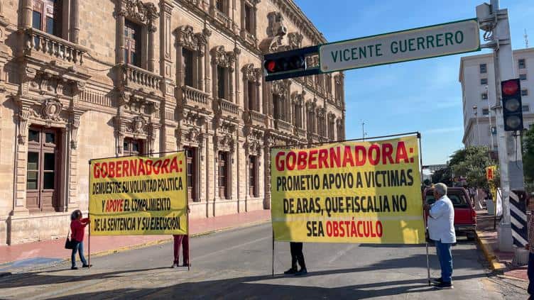 Chihuahua, Chih.- Como parte de una manifestación de ciudadanos afectados por la empresa Aras, un grupo de personas bloqueó la calle Aldama, a la altura del cruce con Vicente Guerrero.
