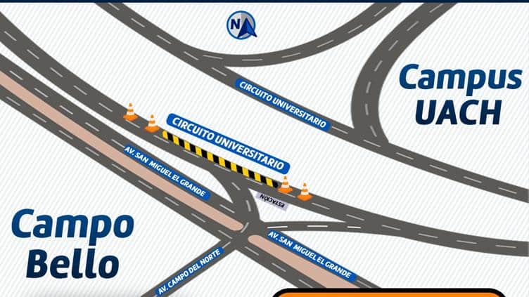 Chihuahua, Chih.– A partir del martes 30 de septiembre, de 8:00 a 17:00 horas, el Gobierno Municipal reducirá la circulación en el carril izquierdo del Circuito Universitario, a la altura de la avenida Campo del Norte, debido a las obras del programa Trayecto Seguro Vial. El carril derecho permanecerá abierto al tránsito vehicular.