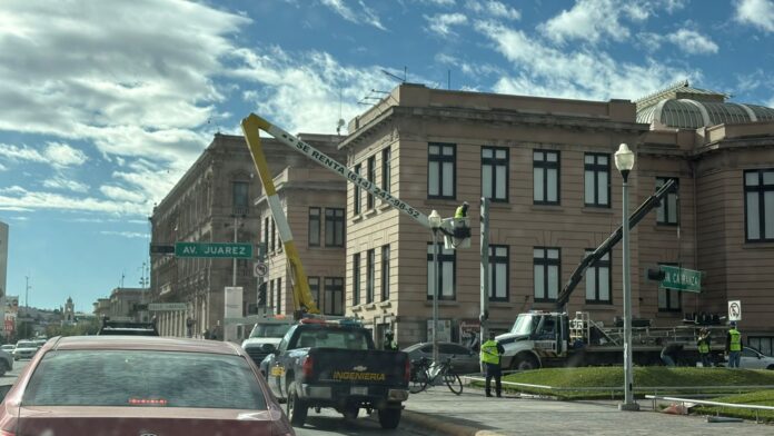 Trabajadores comenzaron con la reinstalación de semáforos en el primer cuadro de la ciudad de Chihuahua con el objetivo de restablecer el flujo vehicular tras los operativos implementados en días recientes.