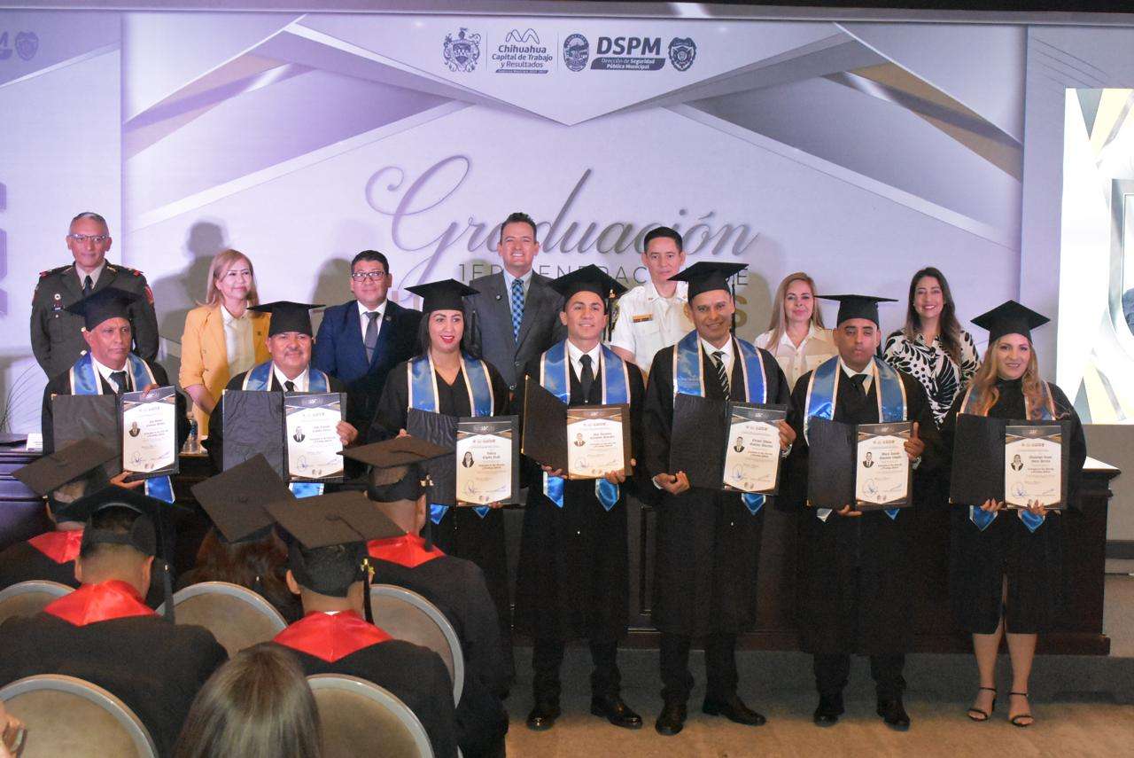 Chihuahua, Chih.- El alcalde Marco Bonilla encabezó la ceremonia de graduación de la primera generación de egresados del Instituto Superior de Seguridad Chihuahua (ISSCUU), conformada por 44 alumnos: 24 de la licenciatura en Alta Dirección y Tecnología Policial y 20 de Alta Dirección y Administración de Emergencias.