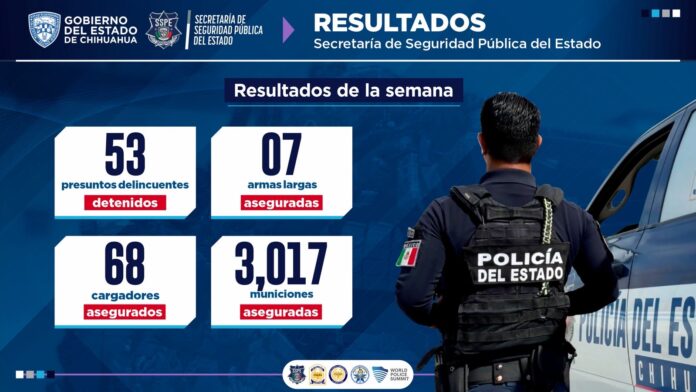 Además, del 23 de febrero al 1 de marzo se registraron 53 detenciones en distintos puntos del estado, así como el aseguramiento de armas, más de 3 mil municiones, un explosivo y cerca de 14 mil 790 dosis de droga. La SSPE reiteró que mantiene operativos permanentes en la sierra, la frontera y la zona centro para reforzar la seguridad en Chihuahua.